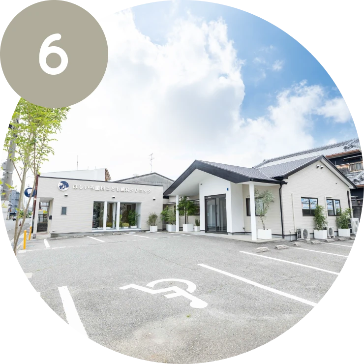 医院のすぐ前に駐車場を完備しており、小さなお子さま連れでも安心してご来院いただけます。雨の日でもスムーズにご来院いただける環境です。